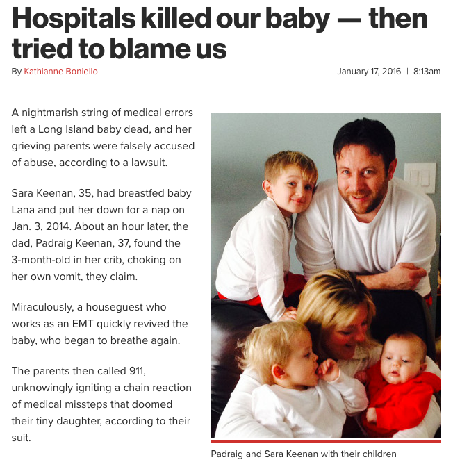 As sad as it sounds, though, the Riders and the Pelletiers are the lucky ones. A family in New York found themselves facing allegations of child abuse after their infant died at the hands of New York doctors, according to a lawsuit filed last year. The suit alleges that the Long Island infant was pumped full of a "cornucopia of drugs," including Propofol, "the powerful sedative linked to Michael Jackson's death" according to a NY Post article. As the baby lay dying, Suffolk County social workers and a "pediatric child abuse specialist" were accusing the parents of shaking her to death, a charge the parents contend was fabricated to cover up the hospital's own serious errors in the child's treatment.