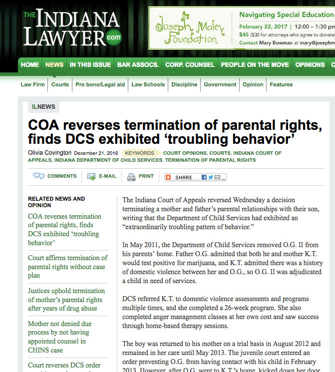 An Indiana Court of Appeals similarly overturned a TPR decision and accused the Department of Child Services of an "extraordinarily troubling pattern of behavior." The case involved a mother who had fled an abusive relationship and completed every requirement set before her for unification, but who lost her son anyway.