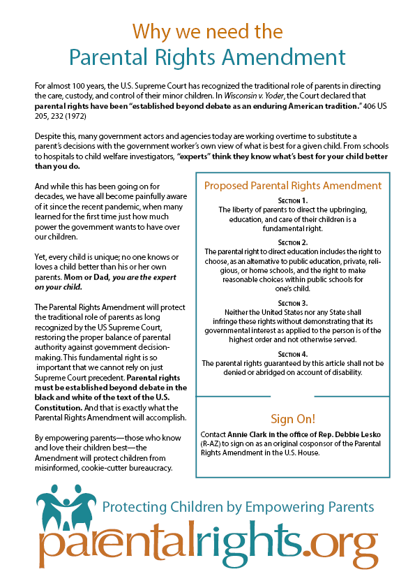 Update: The Parental Rights Amendment is currently in the U.S. Senate, and is being introduced in the U.S. House. Help urge Congress to pass it.