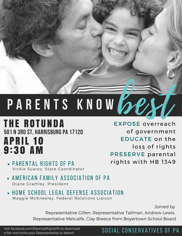 HB 1349 , a bill protecting parental rights, is currently in the PA House. Invite your lawmaker to this event to help him or her understand how important it is to preserve parental rights! Your lawmaker’s contact info can be found here, and here’s an invite to download, print, and mail.