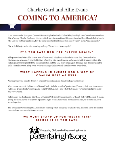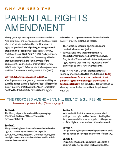 Model language for a state resolution in support of the Parental Rights Amendment, in pdf format. For an easy-to-edit docx format, please click here.
