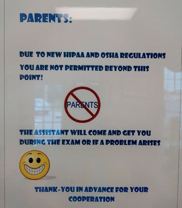 You might assume, as many did when we posted this picture (and as we did ourselves) that the dentist is claiming falsely that new HIPAA guidelines require them to separate parent from child to protect the child’s privacy. What we learned from the West Virginia dentist’s office where this picture was taken, however, was that their office’s open floor plan forces them to balance parental rights against the privacy of the person in the next bay over. Parents, however, are always included in their child’s exam and all decision making. When they saw how their sign was misunderstood, they quickly took it down, and they have assured us that they respect the role of parents with their children.